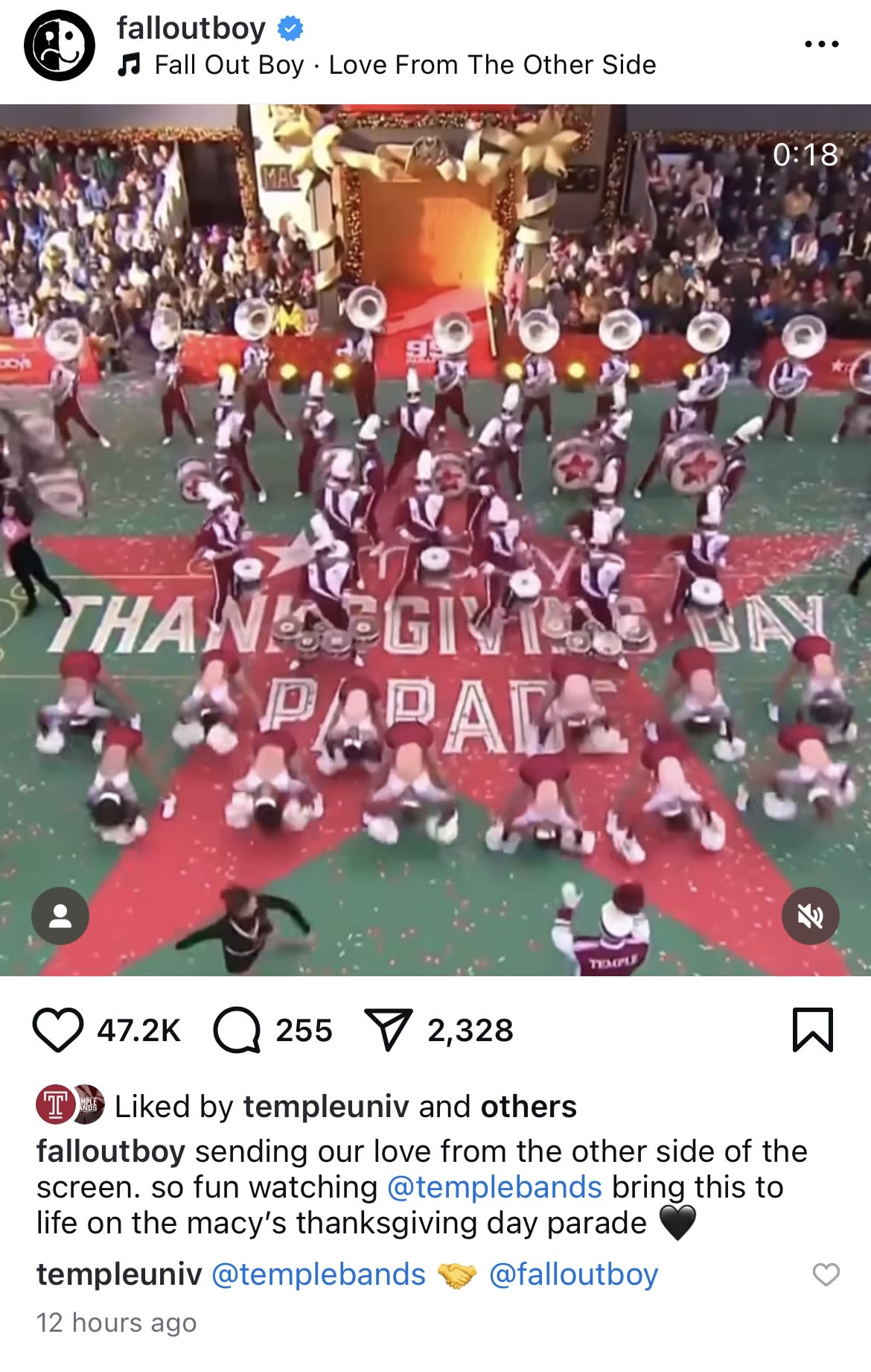 Included among the nearly 35 million viewers who tuned into the parade was Fall Out Boy, who publicly thanked the Diamond Marching Band for their tribute and performance by sharing video of it to their social media channels.